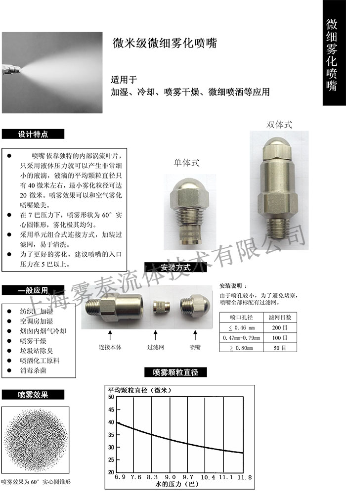 压力式雾化喷嘴 压力式微雾喷嘴 可应用于管道、烟气、风道等加湿; 矿区、道路、脱硫塔等环境除尘; 喷雾冷却、微细喷洒等。 水压越大,喷雾效果越好。为达到理想效果,建议水压不小于5公斤。 在线咨询 产品详情 可应用于管道、烟气、风道等加湿; 矿区、道路、脱硫塔等环境除尘; 喷雾冷却、微细喷洒等。 水压越大,喷雾效果越好。为达到理想效果,建议水压不小于5公斤。 产品名称:压力式微雾喷嘴